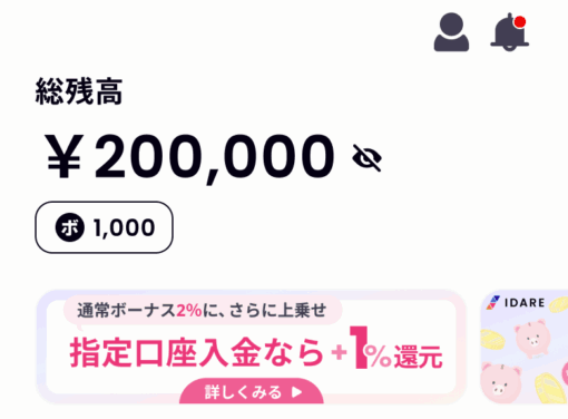 - 月割ボーナス:毎月コツコツ入金をすることで、チャージした残高に応じて「年率2%相当のボーナスポイント」がもらえます。(参考コラム: 年率2%ボーナスの仕組み – IDARE(イデア)| 貯まるキャッシュレス)。