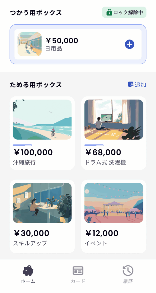 さらにIDAREには、目的ごとに分けて貯められるボックス機能があります。これを使えば、口座を分けなくても支出・貯蓄の目的を可視化でき、モチベーションも維持しやすくなります。