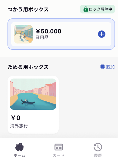 ボックスの設定を行うと、ホームから各ボックスを確認することができます。また、各ボックスの項目をタップすると、該当するボックスの目標額など各情報をチェックできます。