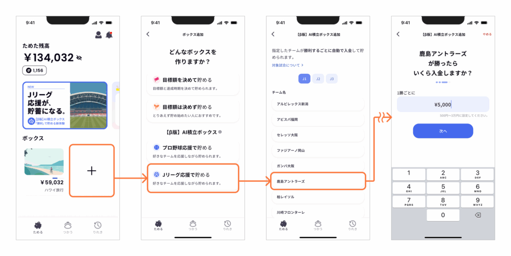 「Jリーグ応援ボックス」の作成は以下の手順で簡単に行うことができます。作成が終わったら、あとは好きなチームが勝利するごとに設定した金額の自動積立が行われます。